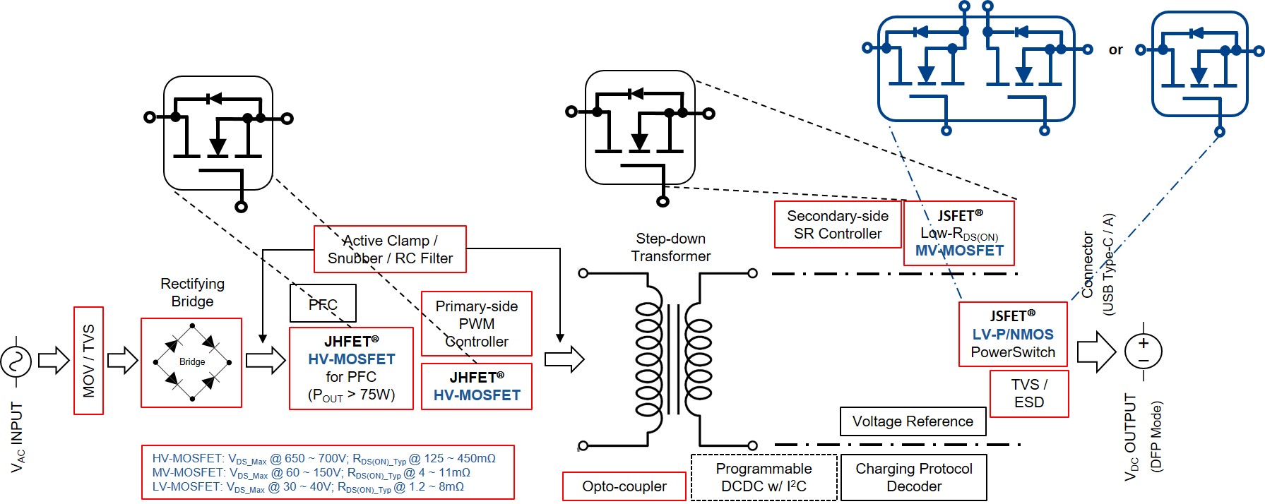 輸出功率從 18W 到 100W (甚至 120W 或更大) 、支持快充協(xié)議 (USB PD3.0/3.1, USB BC1.2, UFCS T/TAF 083-2022, Qualcomm QCxx, MediaTek PExxx、Huawei S/FCP, Oppo D/FCP, Samsung AFC, Apple 2.4A, …)、配置一個(gè)或多個(gè) USB Type-A 及 Type-C 輸出接口的快充充電器日益普遍。它們可以一物多用,同時(shí)為智能手機(jī)、平板、智能手表及筆記本電腦等萬物互聯(lián)數(shù)字化終端里面的鋰電池快速充電。采用第三代半導(dǎo)體功率器件(氮化鎵 D/E-mode HEMT)的設(shè)計(jì),體積小巧以及使用時(shí)溫度不會燙手,由于因近年多家世界排名前列的智能手機(jī) OEM 不把充電器隨著新款手機(jī)一起標(biāo)配而形成曲棍球棒效應(yīng),使得這類小巧的快充充電器成為市場主流。 市場上的快充充電器,常用的交直流電源轉(zhuǎn)換拓?fù)涫?Flyback 及 LLC。Flyback 拓?fù)涑R娪诠β时容^小的設(shè)計(jì),LLC 拓?fù)鋭t常見于功率較大及對交直流電源轉(zhuǎn)換效率要求較高的設(shè)計(jì)。因?yàn)?BOM 相對 LLC 拓?fù)浔容^簡單,ACF-Flyback 拓?fù)湟查_始被中/小功率的設(shè)計(jì)采用,特別是初級使用高壓氮化鎵 HEMT 的設(shè)計(jì)。無論是那種拓?fù)洌斐涑潆娖鞯膬?nèi)部結(jié)構(gòu)示意圖大概如上: 針對快充充電器的成用,捷捷微電 能提供完整的分立器件解決方案。比如,AC 輸入端防浪涌的 MOV、TVS、鉗制變壓器漏感而對原邊的高壓 MOSFETs VDS_Max 產(chǎn)生過壓的快恢復(fù)整流管、原邊 PFC (75W 以上的設(shè)計(jì)) 和匹配 PWM 的高壓 MOSFET、副邊同步整流中/低壓 MOSFETs、USB Type-A 及Type-C 端口的低壓 MOSFETs 及 ESD 保護(hù)等。