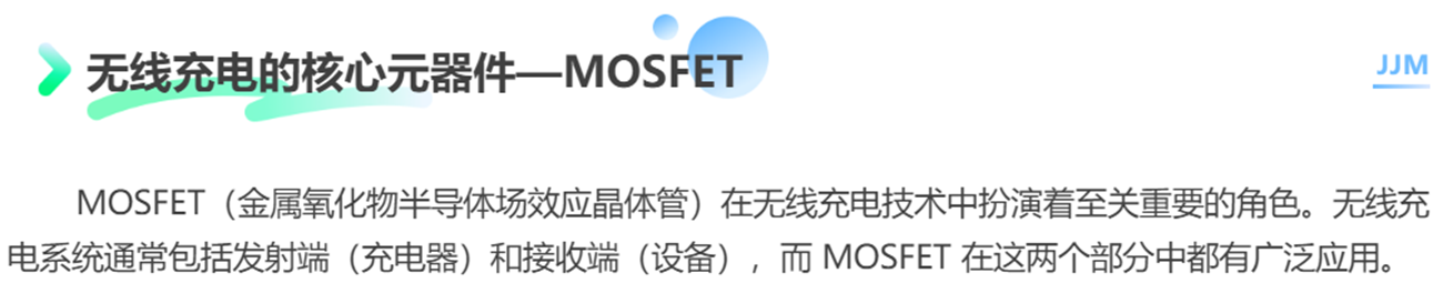 MOSFET(金屬氧化物半導體場效應晶體管)在無線充電技術中扮演著至關重要的角色。無線充電系統(tǒng)通常包括發(fā)射端(充電器)和接收端(設備),而 MOSFET 在這兩個部分中都有廣泛應用。