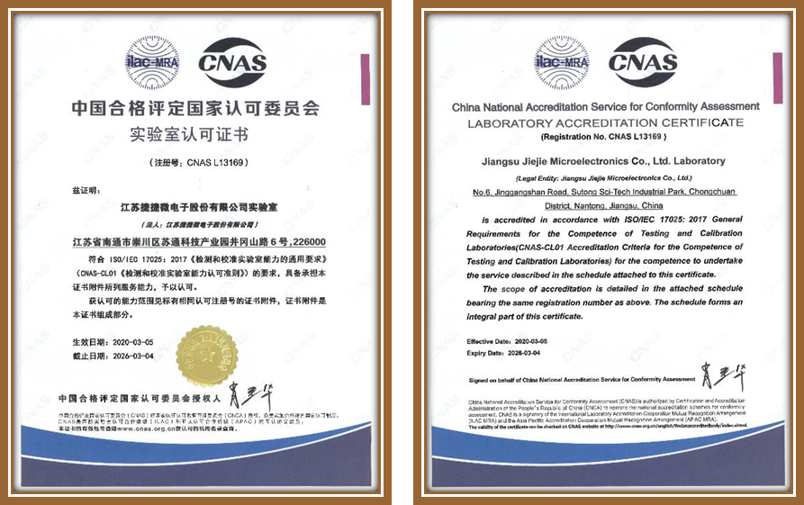 江蘇捷捷微電子股份有限公司實驗室測試中心,提供多種可靠性試驗,包括環(huán)境可靠性測試、板級可靠性試驗,使用壽命可靠性測試和全方位的失效分析服務(wù)。 捷捷微電子股份有限公司實驗室已經(jīng)獲得中國合格評定國家認(rèn)可委員會的實驗室認(rèn)可證書(CNAS認(rèn)證) 江蘇捷捷微電子股份有限公司實驗室測試中心成立于 2011 年,分南通、啟東、深圳3個測試場地。現(xiàn)有工作人員50名,其中管理人員 5 名,檢測人員 45名,簽字授權(quán)人4名,中級職稱人員2名,助理職稱人員6名,本科學(xué)歷人員21名。實驗室占地面積2000平方米,南通1200平方米,啟東800平方米。2018年8月發(fā)布并實施實驗室管理體系,并在2020年3月取得CNAS實驗室認(rèn)可證書(L13169)。實驗室現(xiàn)有各類設(shè)備近170臺,可開展可靠性試驗項目20余項,浪涌過電壓檢測項目10余項,失效分析10余項以及特性測試等項目。與中科院微電子所、西電、中車等單位存在長期合作關(guān)系。